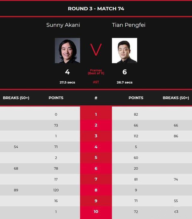 本场比赛,双方打得相当纠结。田鹏飞先声夺人,凭借多次上手,以82-0拿下首局。不过第2局,田鹏飞虽然轰出单杆66分,但关键失误葬送好局,宋沙瓦以73-66扳平比分。第3局,田鹏飞轰出单杆86分,以112-1再胜一局。但第4局,宋沙瓦凭借单杆54分,以71-5再次将比分扳平,进入局间休息。