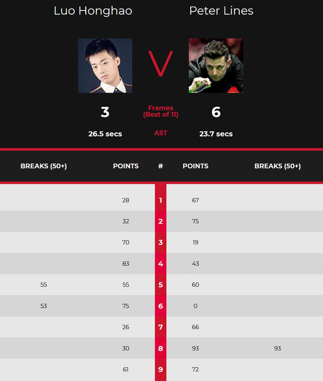 在上半场,罗弘昊整体状态一般,莱恩斯虽然也未能打出单杆50+,但还是67-28、75-32连赢两局,罗弘昊出师不利,0-2落后。不过罗弘昊的调整能力也比较强,70-19和83-43做出回敬,2-2打平。在前四局,两人打成平手,且均未能打出单杆高分,能够看出,还是比较谨慎的。