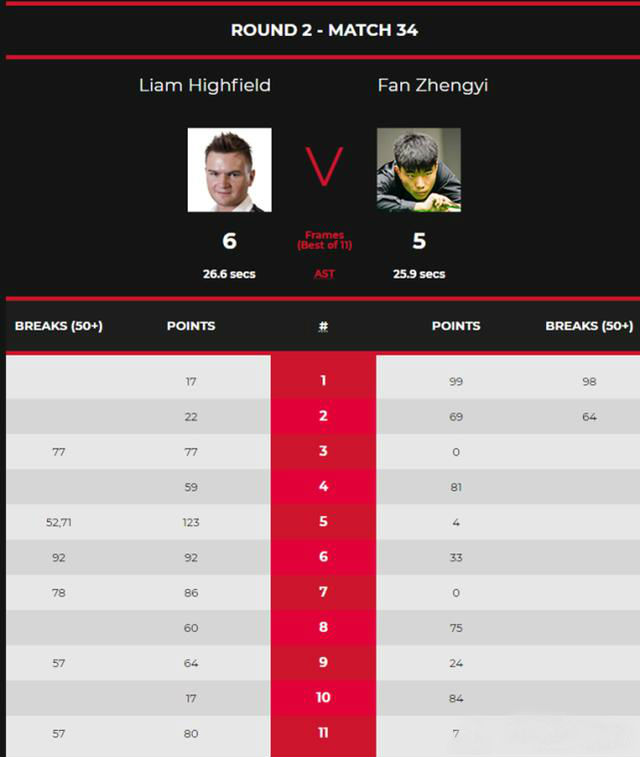 本场比赛,范争一进入状态非常快,前两局打出两杆50+(98分、64分),2-0取得良好开局。第3局,海菲尔德单杆77分零封范争一,比分来到2-1。第4局,范争一81-59赢下,3-1领先。
