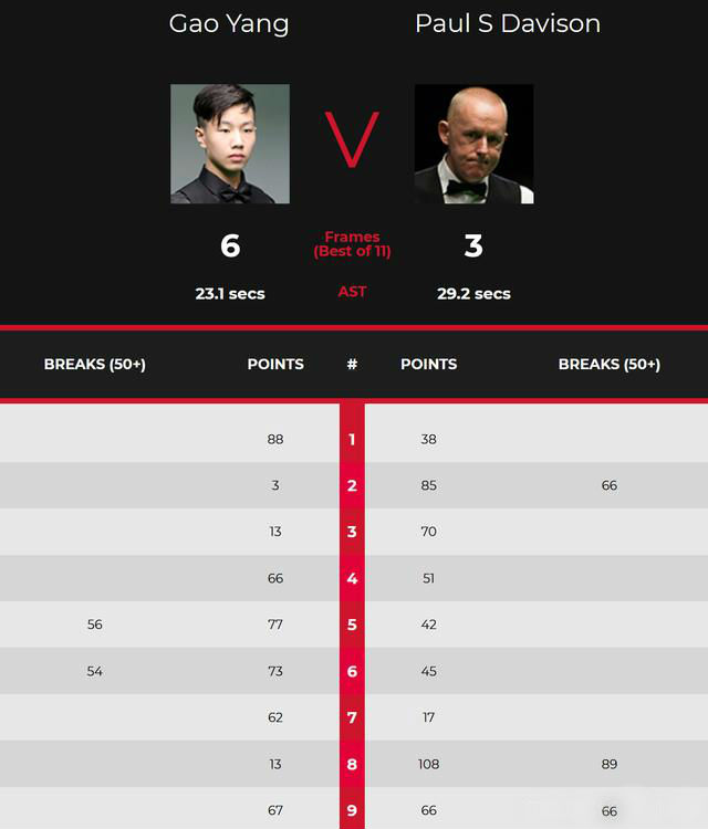 第5局,戴维森单杆42分,红球不进;高阳随后两次上手机会,单杆20分,单杆56分拿下,3-2领先。第六局,戴维森打进红球,黑球不进;高阳单杆54分,红球失误;戴维森单杆38分,母球摔袋;高阳打进红球,做球;戴维森单杆6分,黄球失误;高阳单杆9分超分,蓝球不进;戴维森继续上手,一方缠斗过后,高阳打进蓝球拿下,高阳4-2。