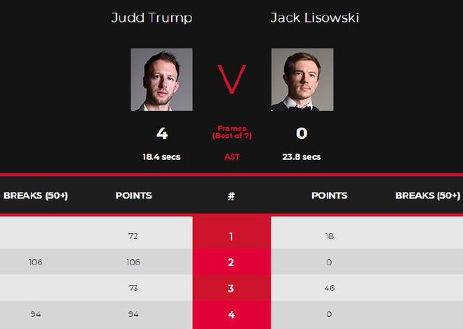 首局,特鲁姆普一上来进入状态就很快,利索夫斯基则有些慢热。双方经过多次上手,特鲁姆普以72-18先胜一局。第二局,利索夫斯基手感全无,而特鲁姆普则是轰出单杆106分,以106-0零封对手。