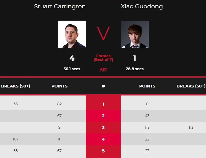 第三局,卡林顿9分中断,肖国栋单杆113分一杆制胜。第四局,肖国栋22-4中断,卡林顿追分,单杆107分迅速拿下,3-1获得赛点。第五局,卡林顿12-0打丢蓝色球,肖国栋23-12反超失误,卡林顿上手拿下,4-1大胜。