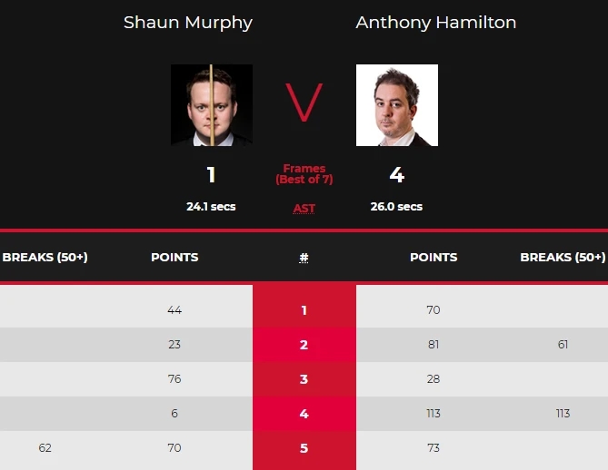 第一局,汉密尔顿单杆拿到44分后,墨菲上手连续得分。随着打进粉球,来到36分。面对倒数第2个红球,轻松推进左侧底袋,叫到黑球!将黑球同样打进左侧底袋!不过拿到44分后,机会不好,没有得分。对手连续拿分,实现70-44的反超,局分1-0领先了。第二局,汉密尔顿单杆61分,局分2-0。第三局,墨菲76-28拿下,局分1-2!此后第四局,墨菲继续被动,对手轰出单杆113分,局分3-1!