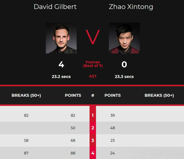 第三局,吉尔伯特单杆58分、58-23领先,防守中赵心童又漏机会,吉尔伯特再次上手扩大分差,逐渐终结了本局悬念,3-0领先,吉尔伯特拿到了赛点。第四局,吉尔伯特仅拿到1分便打丢绿球,赵心童上手,24分后又中断,吉尔伯特上手,单杆87分,完成了超分拿下,4-0横扫。