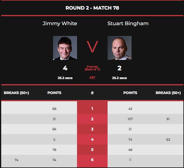 第一局,怀特68-43拿下。第二局,宾汉姆单杆61分,以107-21拿下。第三局,怀特66-51拿下。第四局,宾汉姆单杆63分,以74-5拿下。双方2-2。