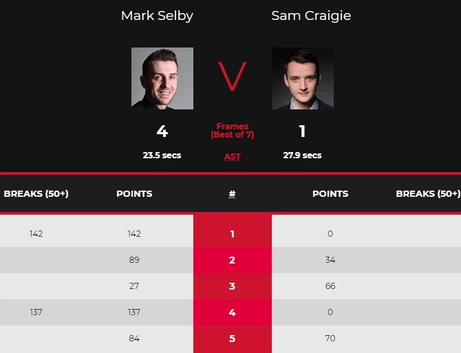 第四局,克雷吉进攻不进,塞尔比单杆137分清台拿下。塞尔比3-1赛点。第五局,克雷吉解球留下机会,塞尔比单杆43分防守;克雷吉凭借红球,单杆6分防守;塞尔比解球留下机会,克雷吉单杆单杆32分,红球不进;塞尔比单杆24分,最后一颗红球选择防守;克雷吉一次解到粉球,一次没解到,塞尔比77-38超4分;克雷吉做球,塞尔比没有解到,延分;克雷吉单杆28分,70-77,台面只剩黑球;克雷吉翻袋不进,塞尔比打进黑球拿下比赛。