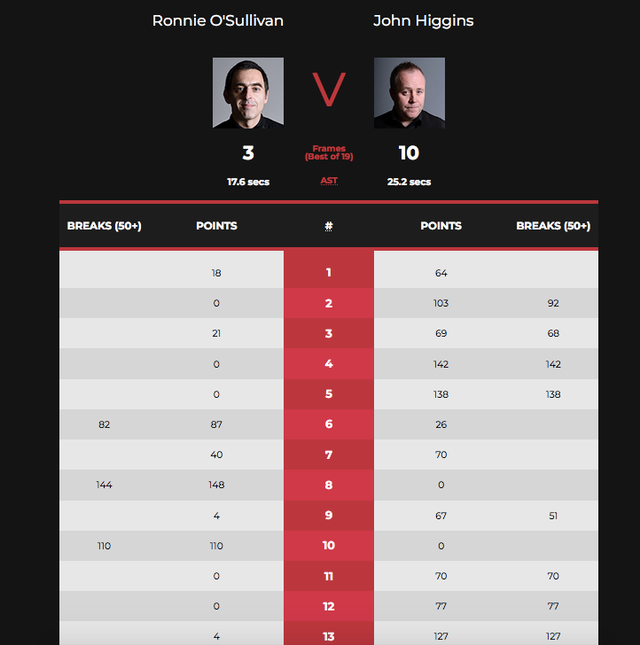 第9局,希金斯凭借多次上手机会以单杆51分的表现确定67:4拿下此局从而以7-2领先奥沙利文。第10局,奥沙利文率先拼进远台红球之后成功获得上手机会,他凭借单杆110分的绝佳表现直接零封对手从而以3-7落后希金斯,而这局比赛也是奥沙利文本场比赛最后拿下的一局比赛。