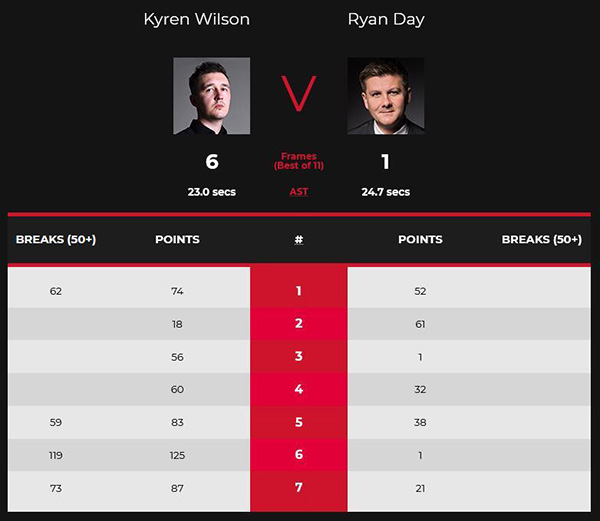 第五局,威尔逊单杆轰58分以83:38拿下此局比赛从而以4-1领先瑞恩·戴。第六局,威尔逊凭借单杆119分的表现以125:1拿下此局从而以5-1领先瑞恩·戴率先拿到赛点。第七局,威尔逊单杆轰73分以87:21拿下此局胜利6-1击败瑞恩·戴成功跻身到八强席位。