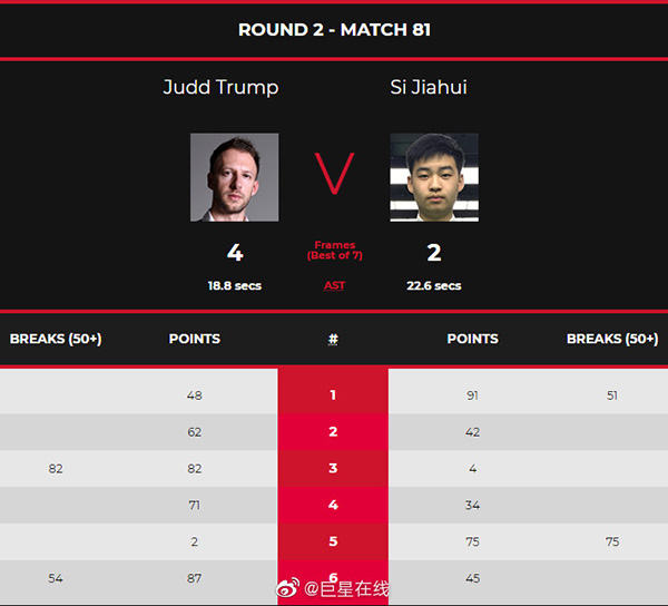 第三局特鲁姆普先被罚4分,此后上手终于打出手感,单杆拿下82分获胜2-1反超。第四局,特鲁姆普几次上手,以71-34拿下连扳三局,3-1获得赛点。第五局,特鲁姆普先进两颗红球,斯佳辉获得机会,单杆75分胜出追上一个赛点。第六局斯佳辉依然有机会拿下,不过出现失误,特鲁姆普一杆拿下54分,以87-45锁定胜局,总比分4-2淘汰斯佳辉。第三轮,特鲁姆普的对手将是伊朗的瓦菲。