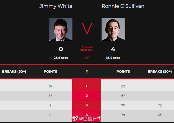 第三局怀特先上手只得8分,架杆进攻红球失误。奥沙利文上手后一杆得到70分,以70-8再胜3-0拿到赛点。第四局双方多回合防守,奥沙利文只拿6分出现静电。怀特进攻未果,奥沙利文再拿机会得到8分。怀特进攻红球再失误,奥沙利文上手单杆65分,以79-0零封总比分4-0横扫怀特打进32强。