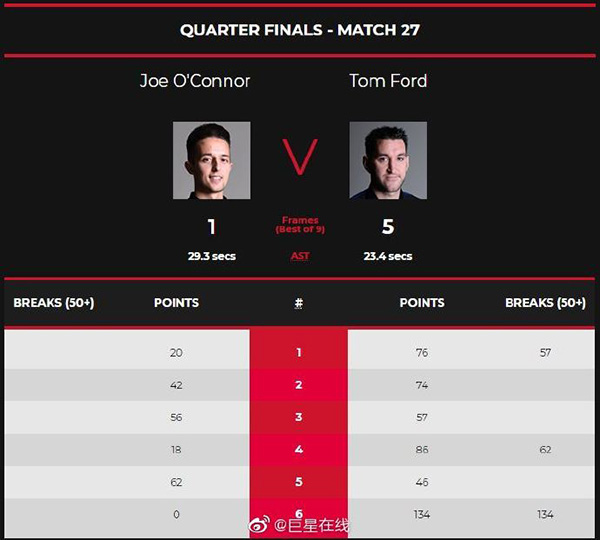 福德(世界排名第29)延续前两轮好的势头,面对奥康纳,福德可谓是速战速决。第一局,汤姆-福德单杆57分,以76比20拿下;第二局,汤姆-福德74比42拿下;第三局,汤姆-福德以57比56险胜;第四局,汤姆-福德单杆62分,以86比18拿下。汤姆-福德4比0强势开局。第五局,奥康纳62-46追回一局。第六局福德清台,轰出单杆134分零封、一杆制胜,5-1大胜搭上四强班车。