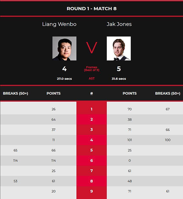 梁文博的对手是杰克·琼斯,两人之前多次交手,梁文博胜多负少。这一次,杰克·琼斯快速进入状态,前四局打出一杆破百、两杆60+,大比分3-1领先。休息回来后,梁文博找到感觉,他连续打出单杆65分和114分,将大比分追成3平。之后,两人各赢一局,比赛进入决胜局。