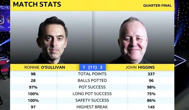 首局比赛中,奥沙利文率先拼进红球成功获得上手机会,随后就直接打出单杆97分的表现并以97:0拿下此局比赛的胜利取得1-0领先的同时更是迎来本场比赛开门红。第二局,希金斯凭借两杆41分的表现拿到82分并以82:1拿下此局比赛的胜利将比分改写为1-1平。第三局,希金斯打出非常火热的手感,他在拼进远台红球之后直接轰出单杆145分一举打破颜丙涛创造的本届赛事单杆最高分并以145:0拿下此局比赛胜利取得2-1领先。第四局,希金斯单杆轰出110分以110:0拿下此局3-1领先奥沙利文。