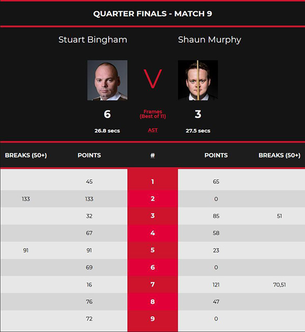 第五局,宾汉姆打出单杆91分,91-23拿下,并以3-2反超比分。第六局,宾汉姆尽管也有失误,但他能够持续发力,可他的对手墨菲其竞技状态和手感依旧不佳。宾汉姆通过几次上手,以69-0零封墨菲,比分来到4-2。第七局,墨菲找到久违的手感,他单局单杆两杆50+(70分、51分),121-16扳回一局,比分追成4-3。第八局,宾汉姆与墨菲又一次陷入到胶着的比赛之中,他以76-47赢下,比分优势扩大到5-3,并赢得本场比赛的赛点。