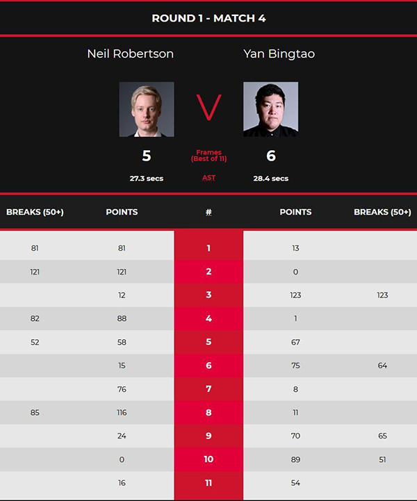 在首局比赛中,颜丙涛在拿到13分后出现失误,随后罗伯逊成功打进红球上手,他凭借单杆81分的强势表现以81:13拿下此局比赛的胜利取得1-0领先的同时更是迎来本场比赛的开门红。第二局,罗伯逊在打进红球之后就不再给对手任何的上手机会,他凭借单杆121分的表现以121:0零封对手将比分改写为2-0领先颜丙涛。第三局,罗伯逊在拿到12分后失误,颜丙涛打出单杆123分的表现以123:12拿下此局将比分改写为1-2落后罗伯逊。第四局,罗伯逊单杆82分以88:1拿下此局确定3-1领先颜丙涛。
