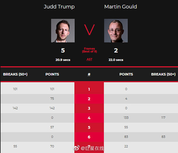 局休过后,第五局,古尔德经过努力以55-14领先,特鲁姆普抓住机会单杆43分清台以57-55逆转。特鲁姆普4-1赛点。第六局,特鲁姆普薄红球没进,来了一杆天女散花,古尔德单杆83分追回一局。第七局,特鲁姆普7-22落后,特鲁姆普长台上手单杆55分,古尔德失误送上机会,特鲁姆普单杆8分拿下。