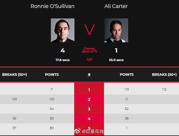 第四局奥沙利文先进红球后,打出一杆56分,卡特追到38-57,错失最后一颗红球,奥沙利文上手清台,以83-38再下一城3-1获得赛点。第五局,奥沙利文一鼓作气,单杆拿下57分以83-1取胜,连扳四局总比分4-1淘汰卡特。第二轮,奥沙利文的对手将是霍金斯。