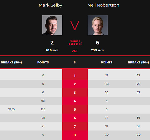 下半场第五局,塞尔比两次上手,分别得到67分和59分,以126-0再追一局。第六局罗伯逊在落后的情况下,长台上手一杆56分逆转,以77-40取胜4-2领先。第七局塞尔比先得21分,罗伯逊上手后单杆91分拿下,5-2获得赛点。第八局,罗伯逊一杆制胜,打出本场个人第二杆破百,攻下130分零封,这也是他职业生涯的第750杆破百,成为奥沙利文、希金斯、亨德利和特鲁姆普后的第五人。最终,罗伯逊以6-2击败塞尔比,两个月内连续第三次战胜对手,打进四强将在半决赛面对周跃龙。
