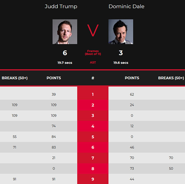 第一局,特鲁姆普有些不在状态,出现了简单失误,被戴尔抓住机会,后者62-39先下一城。第二局和第三局,特鲁姆普火力全开,连续打出了两杆单杆109分,连赢两局,2-1反超。第四局,特鲁姆普零敲碎打74-12再次拿下,中场休息前,特鲁姆普迅速3-1领先。
