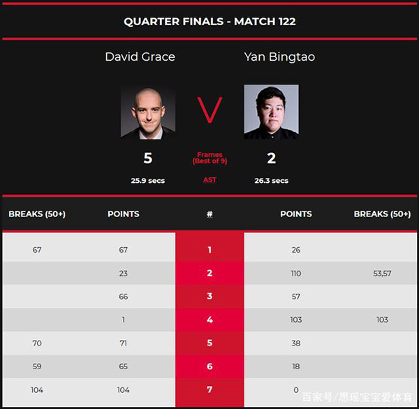 15分钟局间休息后,第5局中颜丙涛底袋失误错失围球机会 ,此后格雷斯打出一杆70分拿下这局,总分3-2再度领先 。第6局这一次颜丙涛没能扳回比分,围球拿下18分后失误,格雷斯随后拼进红球做出斯诺克,颜丙涛解球失误漏球,格雷斯上手一杆打出58分超分拿下,4-2率先来到赛点。第7局中颜丙涛开局留下长台,格雷斯继续保持好状态,上手打出单杆破百拿下这局,总分5-2击败颜丙涛挺进四强。