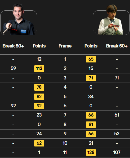 第十一局:雷佩凡单杆107分,最终以6比5绝杀汤姆·福德,成功晋级。
