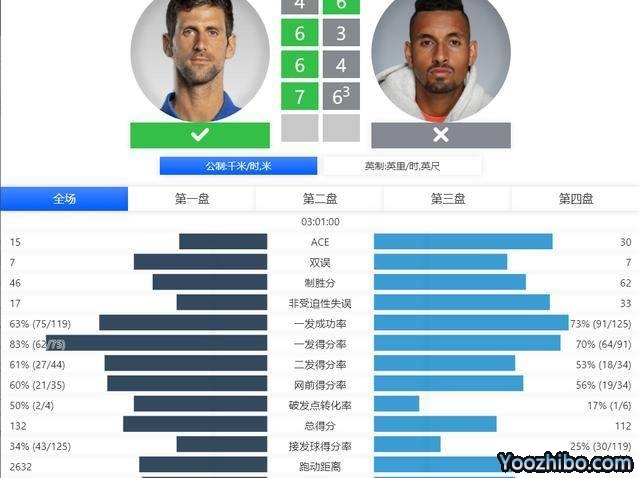 第二盘比赛,德约科维奇的发球状态明显提升,加上底线相持也主动变线,以6-3扳回一盘,大比分1-1。第三盘比赛,前八局双方各自爆发,比分4-4。德约科维奇在关键的第九局实现破发,比分5-4。第十局比赛,德约科维奇成功爆发,大比分6-4拿下,大比分2-1拿下。