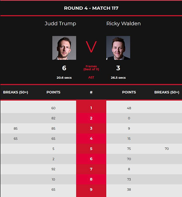 特鲁姆普面对淘汰马克-威廉姆斯的沃顿,首局双方各有机会,特鲁姆普把握住彩球,以60-48先声夺人。第二局特鲁姆普几次上手,以82-0零封再下一城。第三局沃顿先得9分后十五,特鲁姆普一杆拿下85分3-0领先。第四局沃顿又是先得15分后送出机会,特鲁姆普打出一杆65分,上半场就取得4-0的领先。