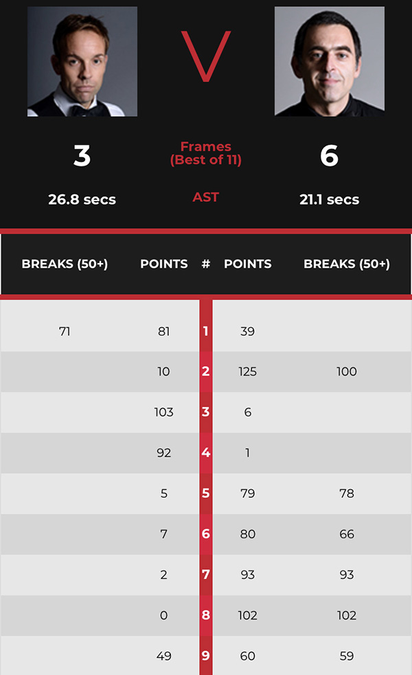 如果说第一阶段4局比赛让我们看到的是奥沙利文冰凉的手感和不放弃的做派的话,那么后面的比赛几乎就变成了他一个人的表演。