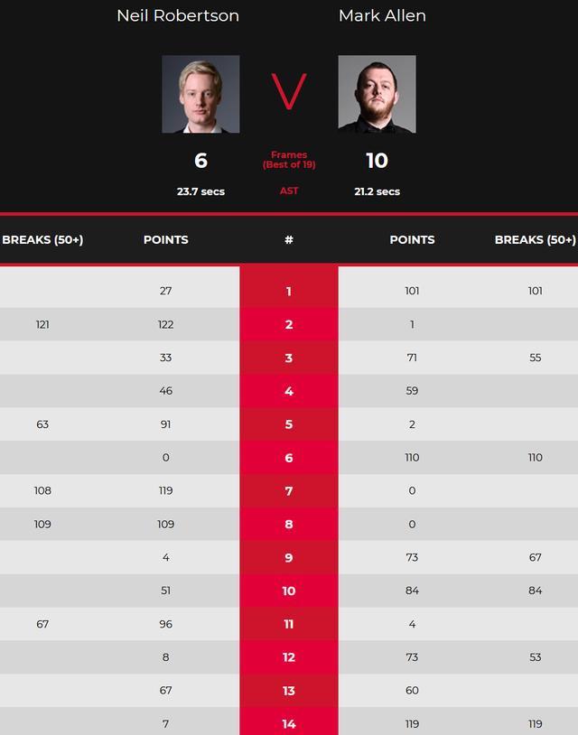 第5局罗伯逊一杆得到63分,以91-2取胜追上一局,第6局艾伦轰出第二杆破百,攻下110分零封4-2领先。第7局和第8局,罗伯逊手感大爆发,连续两局破百,先后攻下108分和109分,以119-0和109-0连续零封,迅速追至4-4。第9局,马克.艾伦凭借单杆67分的表现以73:4拿下此局比赛的胜利以5-4拿下此局比赛的胜利结束双方第一阶段比赛的胜利。