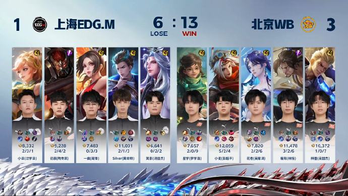 前期北京WB处于小劣局势,但进入中期后,局面开始扭转。小麦的后羿几波关键的大招开团效果显著,为团队创造了良好的输出环境。暖阳的大司命和花卷的甄姬在正面团战中也发挥出色,打出了应有的作用。凭借团队的出色配合,北京WB再下一城,率先来到赛点。本局MVP给到了北京WB花卷的甄姬。