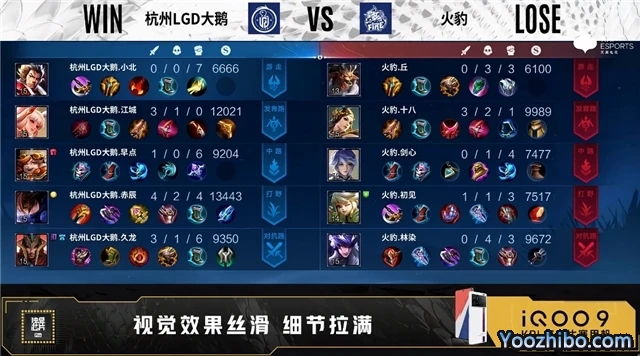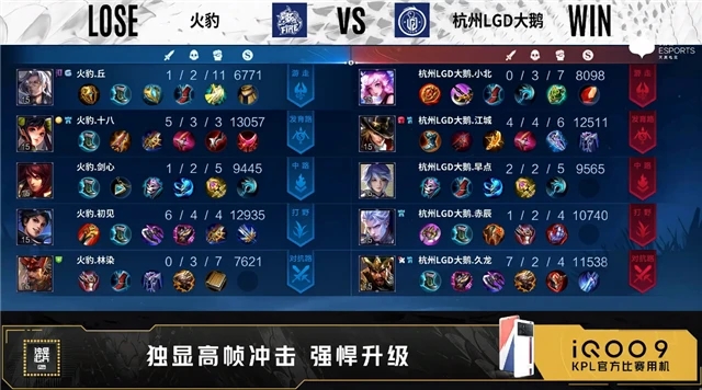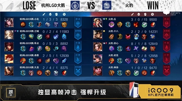 开局杭州LGD大鹅入侵野区反掉红BUFF。2分42秒杭州LGD大鹅反掉红BUFF。3分35秒发育路团战火豹打出1换2并拿到一血。5分36秒杭州LGD大鹅摧毁敌方中路外塔。5分45秒杭州LGD大鹅拿下暴君,火豹拿下主宰。6分18秒野区团战火豹打出0换3。6分48秒火豹野区击杀大乔。7分59秒杭州LGD大鹅摧毁敌方对抗路外塔。8分31秒火豹野区击杀周瑜。9分05秒杭州LGD大鹅击杀娜可露露并摧毁敌方发育路二塔。10分13秒火豹拿下暗影暴君,野区团战火豹打出0换2。11分18秒火豹拿下暗影主宰。12分32秒火豹摧毁敌方发育路二塔。12分49秒火豹打出0换2并摧毁敌方发育路高地塔。14分04秒杭州LGD大鹅拿下暗影暴君并击杀不知火舞。15分11秒火豹拿下暗影主宰并打出1换3。15分46秒杭州LGD大鹅对抗路击杀蒙犽。16分52秒火豹发育路击杀大乔。17分13秒火豹中路击杀周瑜。17分56秒火豹摧毁敌方水晶拿下比赛。