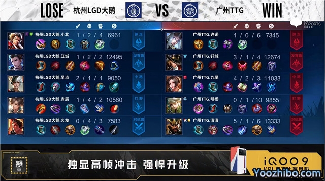 双方常规开局。2分13秒杭州LGD大鹅拿下暴君。2分47秒广州TTG中路击杀不知火舞。4分10秒广州TTG发育路击杀盾山。4分23秒野区团战广州TTG打出1换2。4分50秒双方发育路1换1。5分30秒杭州LGD大鹅发育路击杀鲁班七号。6分42秒广州TTG野区击杀公孙离。7分09秒广州TTG野区击杀盾山。8分52秒野区团战广州TTG打出0换2。10分40秒广州TTG摧毁敌方中路二塔。10分58秒广州TTG摧毁敌方对抗路二塔。11分31秒高地团战广州TTG打出0换4。12分整广州TTG团灭对手摧毁水晶拿下比赛。