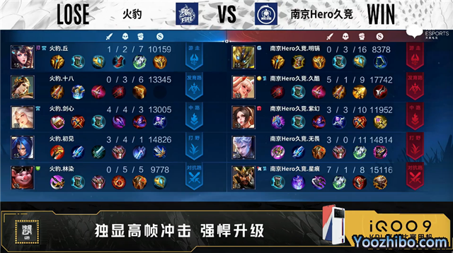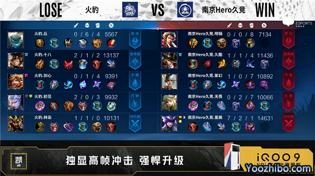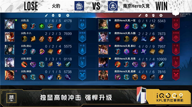 开局火豹入侵野区反掉蓝BUFF。5分14秒火豹对抗路击杀马超拿到一血。5分49秒南京Hero拿下主宰。6分18秒野区双方1换1。8分23秒野区双方1换1。10分21秒双方野区1换1。10分36秒南京Hero中路打出0换2。13分40秒暴君处团战南京Hero打出0换2。15分10秒南京Hero野区击杀盾山。15分54秒南京Hero拿下暗影主宰。16分54秒南京Hero暗影暴君。17分18秒南京Hero摧毁敌方中路高地塔。17分28秒高地团战南京Hero击杀盾山。18分02秒南京Hero强点敌方水晶拿下比赛。