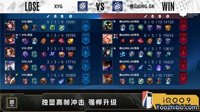 开局XYG蒙犽中路抢线。1分11秒XYG弈星发育路单杀李元芳拿到一血。2分28秒佛山DRG.GK对抗路击杀蒙恬。4分10秒XYG拿下暴君。4分20秒佛山DRG.GK野区击杀蒙恬。5分50秒中路上河道团战双方1换1。6分33秒中路上河道团战双方1换1。6分50秒佛山DRG.GK摧毁敌方对抗路二塔。7分03秒佛山DRG.GK拿下主宰。7分54秒佛山DRG.GK对抗路击杀橘右京。8分27秒佛山DRG.GK中路越塔打出0换2。9分39秒XYG野区击杀李元芳。10分24秒野区团战主宰处团战佛山DRG.GK打出0换4。11分02秒佛山DRG.GK摧毁敌方中路高地塔。12分58秒高地团战XYG打出1换2,佛山DRG.GK摧毁敌方发育路高地塔。14分11秒野区团战佛山DRG.GK打出0换4。14分40秒佛山DRG.GK摧毁敌方水晶拿下比赛。