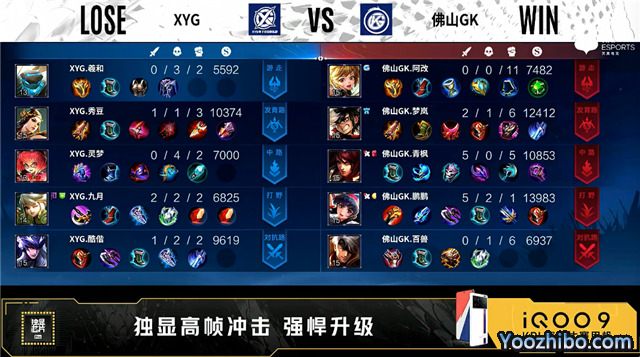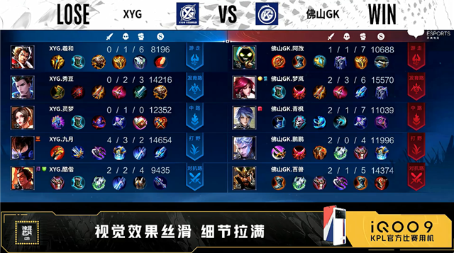 双方常规开局。2分27秒XYG拿下暴君。5分30秒中路团战佛山GK击杀周瑜并摧毁敌方中路外、二塔。6分28秒发育路团战佛山GK打出0换3。7分07秒佛山GK拿下暴君。8分40秒佛山GK摧毁敌方发育路二塔。10分20秒中路团战佛山GK打出0换4。10分20秒佛山GK摧毁敌方水晶拿下比赛。