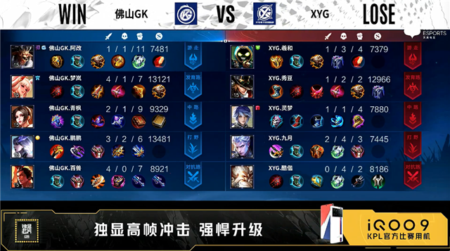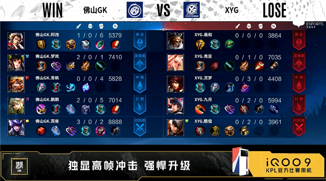 双方常规开局,1分35秒佛山GK中路击杀澜拿到一血。3分46秒佛山GK拿下暴君。7分10秒中路团战XYG打出1换4,澜拿到三连决胜。9分11秒佛山GK拿下主宰。10分35秒中路团战佛山GK击杀吕布。10分56秒佛山GK拿下暗影主宰,11分09秒佛山GK拿下暗影暴君。12分28秒XYG中路击杀伽罗。16分08秒佛山GK拿下暗影主宰,XYG拿下暗影暴君。16分22秒中路团战佛山GK击杀狄仁杰。16分35秒佛山GK摧毁敌方中路外塔。21分21秒佛山GK拿下风暴龙王,并在团战打出1换5。22分11秒佛山GK摧毁敌方水晶拿下比赛。