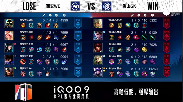 2分23秒,西安WE拿下暴君。3分20秒,佛山GK下路击杀狄仁杰拿下一血。5分10秒,中路团,佛山GK击杀张良。5分36秒,佛山GK下路击杀狄仁杰,随后破掉西安WE下一塔。5分58秒,西安WE拿下主宰。7分05秒,西安WE破掉佛山GK下一塔,随后拿下暴君。7分44秒,佛山GK中路击杀吕布。8分05秒,佛山GK破掉西安WE中一塔。10分14秒,佛山GK破掉西安WE上二塔。10分30秒,佛山GK拿下暴君,中路团,佛山GK打出0换3。11分钟,佛山GK破掉西安WE中二塔和中路高地塔。12分11秒,佛山GK拿下暗影主宰。13分02秒,佛山GK破掉西安WE下二塔。13分20秒,下路团,佛山GK打出2换4,随后破掉西安WE下路高地团。13分54秒,佛山GK击杀镜后摧毁水晶连下三城拿下本场比赛胜利。