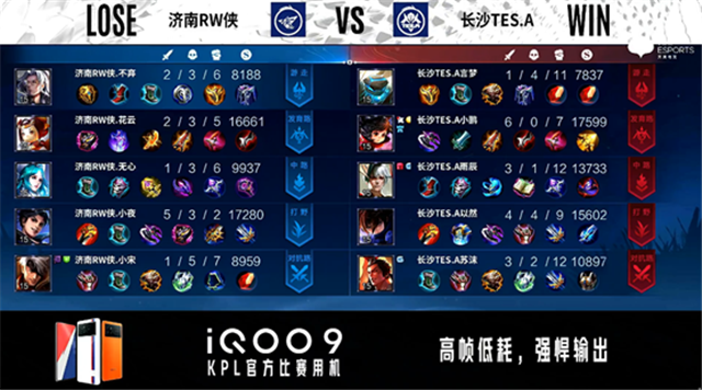 双方常规开局。2分10秒济南RW侠拿下主宰。2分47秒长沙TES.A中路击杀夏侯惇。3分49秒济南RW侠对抗路击杀澜。4分09秒济南RW侠拿下暴君。4分12秒济南RW侠野区击杀嬴政。6分05秒双方对抗路1换1。7分52秒济南RW侠主宰处击杀盾山。9分21秒济南RW侠拿下暴君。9分36秒中路团战长沙TES.A打出1换2。10分19秒长沙TES.A拿下暗影暴君,济南RW侠拿下暗影主宰。11分14秒济南RW侠摧毁敌方发育路二塔。12分23秒济南RW侠摧毁敌方对抗路二塔。12分57秒野区团战长沙TES.A击杀夏侯惇。14分41秒济南RW侠摧毁敌方中路外塔。14分55秒济南RW侠拿下暗影主宰。15分18秒中路团战济南RW侠打出2换3。16分21秒济南RW侠拿下暗影暴君。17分01秒暴君处团战长沙TES.A打出2换4。17分36秒长沙TES.A摧毁敌方中路二塔、高地塔。18分56秒长沙TES.A摧毁敌方对抗路二塔。19分32秒长沙TES.A摧毁敌方发育路二塔。21分17秒龙王处团战长沙TES.A打出0换3。21分45秒长沙TES.A摧毁敌方水晶拿下比赛。