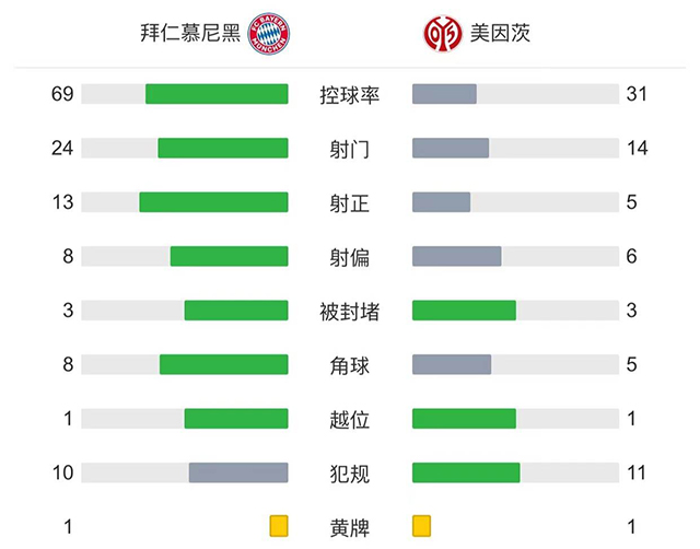 全场比赛结束,拜仁6-2美因茨。