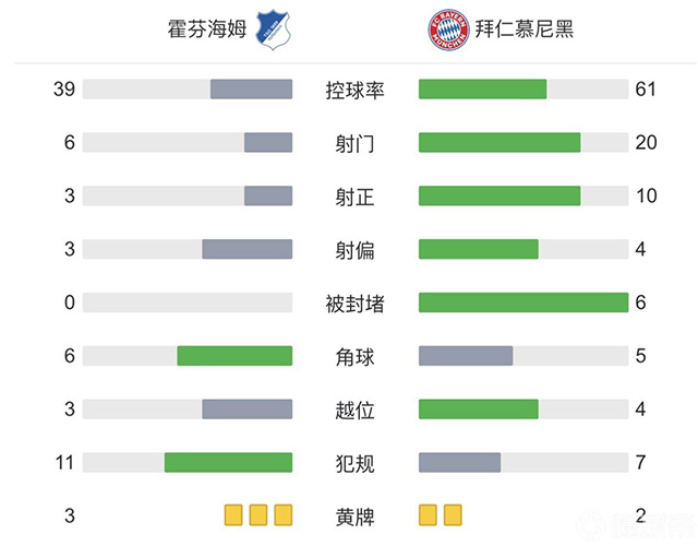 全场比赛结束,拜仁2-0击败霍芬海姆。