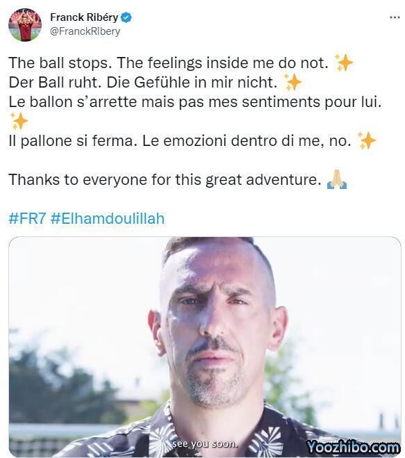 24直播网10月22日里贝里在推特上用英文、法语、意大利语和德语写道:“足球停止了,但我心中的激情没有。感谢所有人陪伴我走过这段伟大的征程。”