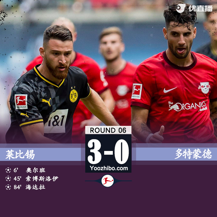 第6分钟,红牛取得进球!索博斯洛伊右路角球开到禁区内奥尔班头球前插破门。莱比锡红牛1-0多特。