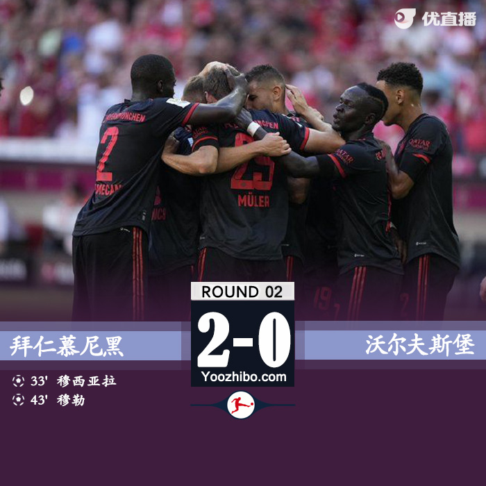 最终全场比赛结束,拜仁慕尼黑2-0战胜沃尔夫斯堡。