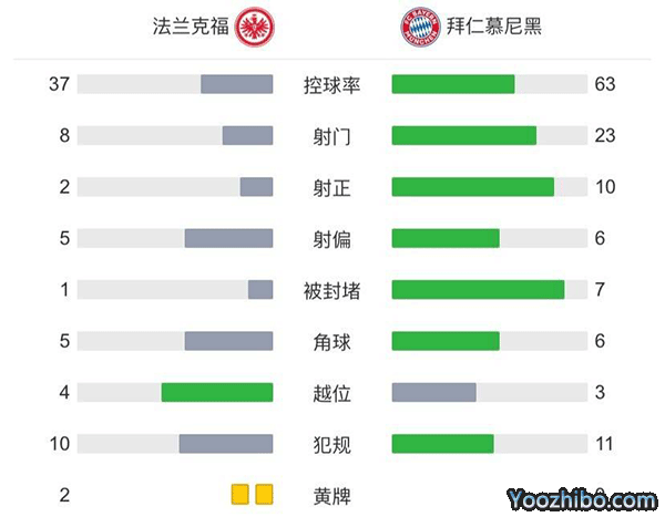 全场比赛结束,拜仁慕尼黑客场6-1大胜法兰克福。