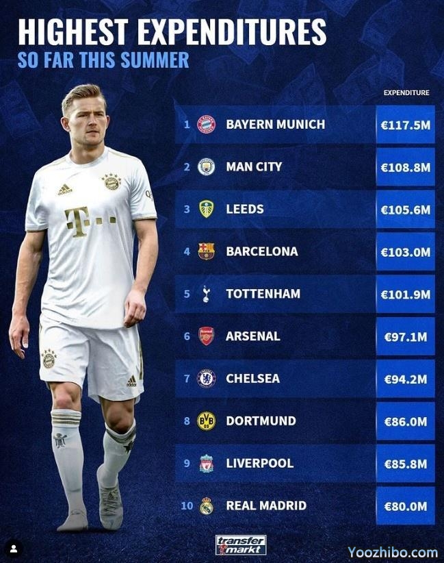 24直播网07月22日讯 今日,德转盘点了今夏转会市场中,到目前为止的各球队签人花销top10:拜仁1.175亿欧居首,利兹联进前三。