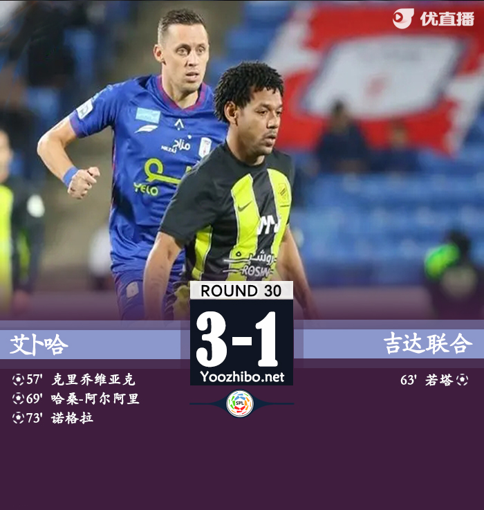 吉达联合首发:1-马约夫、30-阿尔穆萨(79'29-沙姆拉尼)、15-卡德什、37-斯库尔(46'13-山凯蒂)、19-阿尔贾迪、16-加姆迪(79'25-门哈利)、7-坎特、27-艾哈迈德-阿尔加姆迪、77-阿姆里(46'17-萨哈菲)、11-若塔、90-罗马里尼奥
