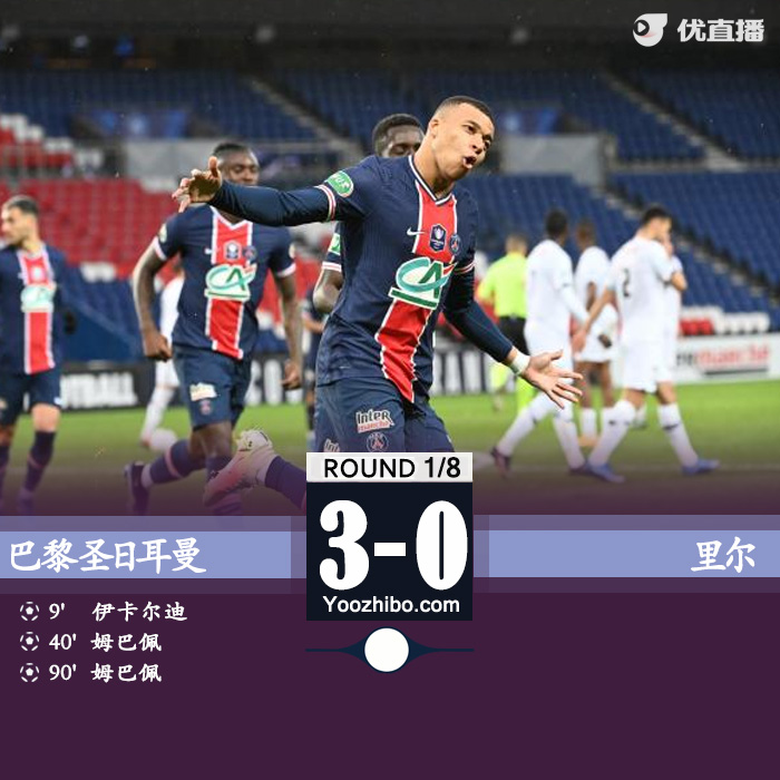 24直播网3月18日讯 北京时间3月18日00:45,法国杯1/8决赛,巴黎圣日耳曼主场对阵里尔。上半场比赛,伊卡尔迪推射破门,随后受伤被换下场,姆巴佩造点并亲自主罚命中。下半场比赛,库尔扎瓦手球送点,亚兹奇点球被纳瓦斯扑出,姆巴佩单刀挑射破门。最终全场比赛结束,巴黎圣日耳曼主场3-0战胜里尔,成功晋级法国杯八强。