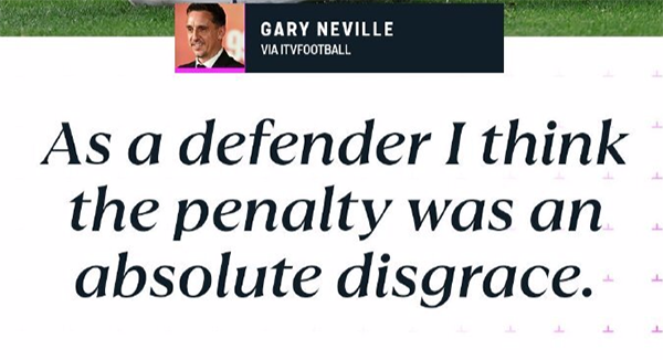 就连英格兰自家名宿加里-内维尔都看不下去了,他直言:“对于我这样一位后卫而言,这绝对不是点球。而从这粒点球获益,绝对是英格兰足球的耻辱。”