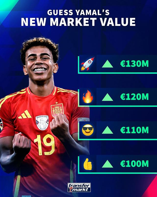 24直播网讯 德转将在周四更新球员身价,他们预热了欧洲杯表现出色的亚马尔身价。