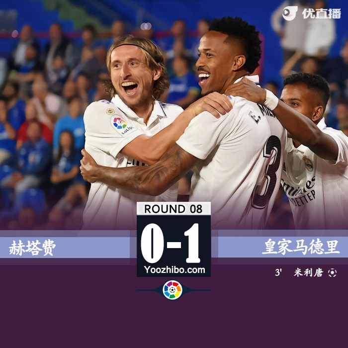 24直播网讯北京时间10月9日03:00,西甲联赛第8轮,赫塔费迎战皇家马德里。上半场比赛,莫德里奇助攻米利唐头球破门,莫德里奇、罗德里戈尝试了多次远射。半场战罢,皇马1-0赫塔费。下半场比赛,皇马禁区内连续3脚打门被解围,众将多次远射均未能破门。最终全场比赛结束,皇马客场1-0赫塔费。